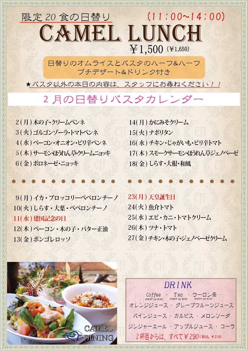 2月の日替わりパスタカレンダー