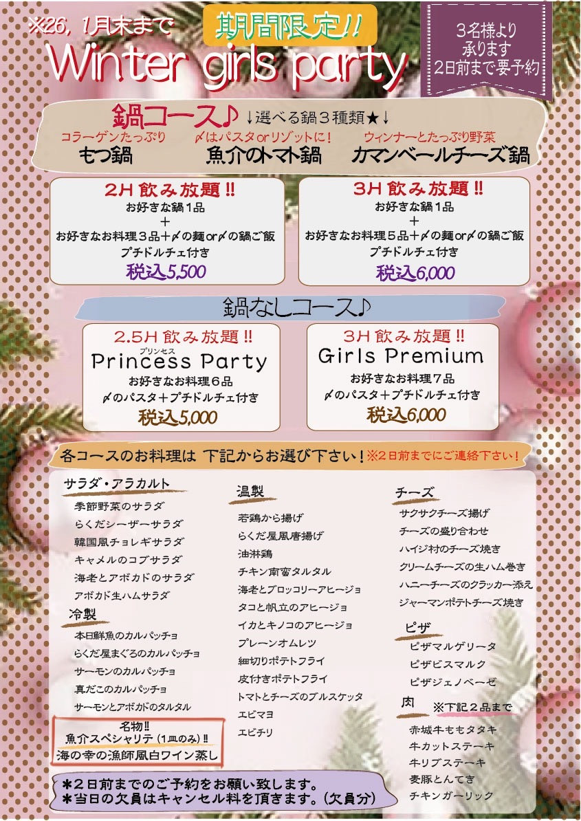 ~2026年1月末まで期間限定!winter girls party~ 3名様より承ります。2日前まで要予約